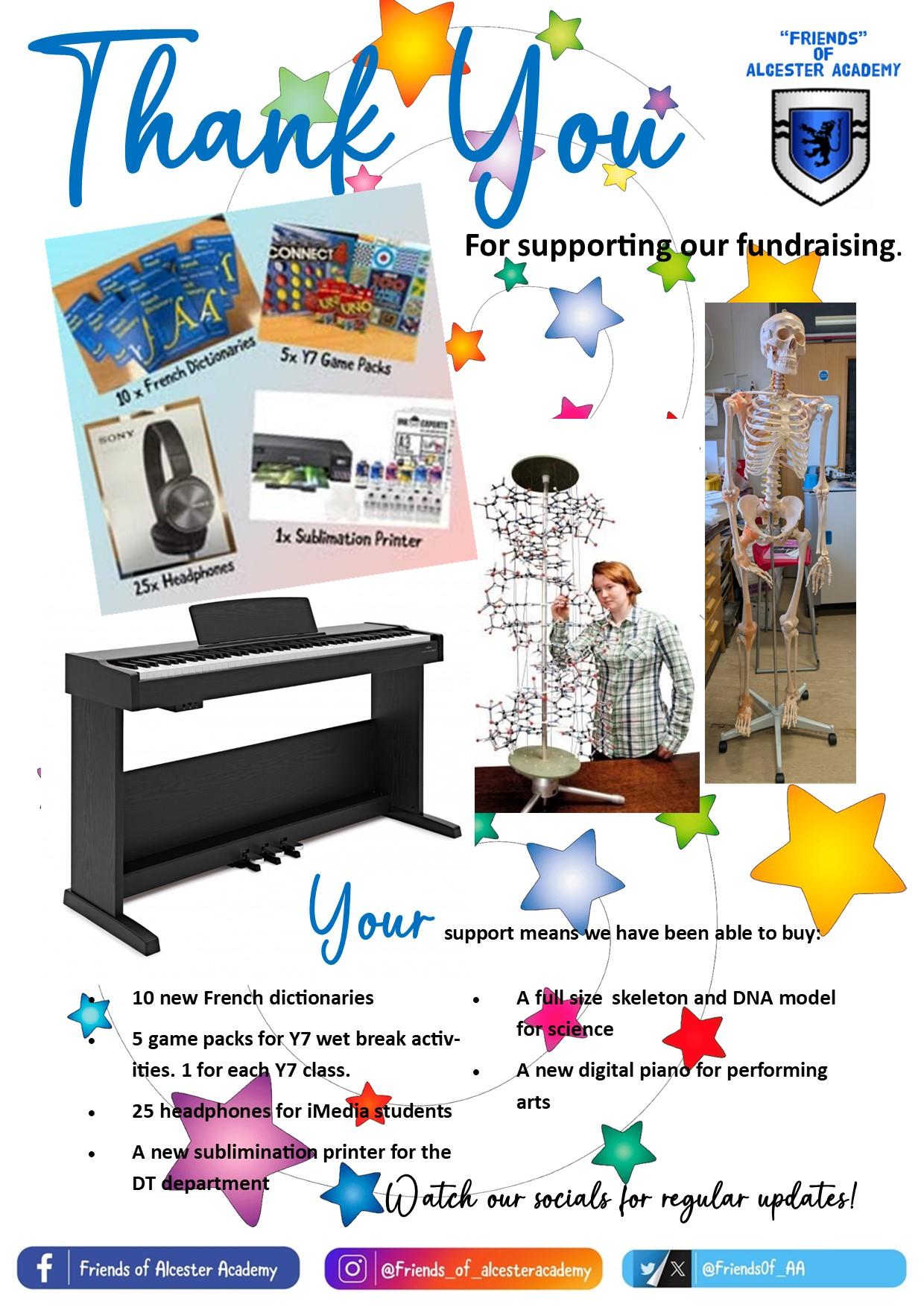Last year you helped us raise an amazing £7188.64 by supporting our events. We spent £3919.59 on items to enhance student life at the Academy and pledged a further £1634 to support future projects.